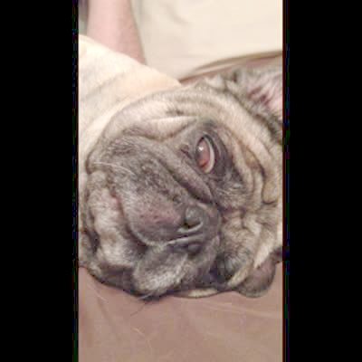 A pug dog sleeps indoors with her eyes open showing only the white part of her eye. A woman wakes her up repeatedly, then lets her fall back asleep as her eyes roll back and show the white parts again.