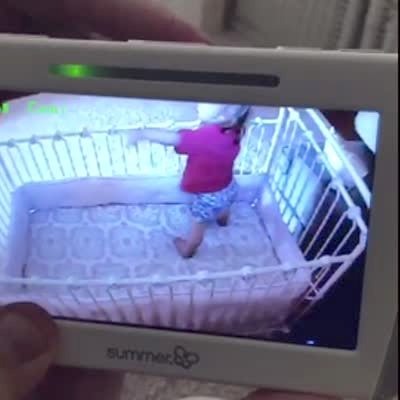 A tot girl quickly lays down in her crib as her dad tells her to take a nap through her baby monitor.