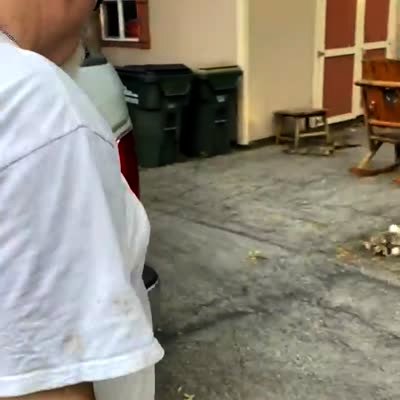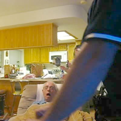 Man & woman bang pots together, turn on the vacuum cleaner & make the smoke detector go off while senior man sleeps in chair. He doesn't hear it or wake up.