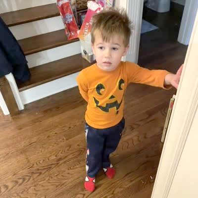 A tot boy walks into a kitchen and says he can't find his lollipop after a nap. A woman asks him to turn around. The sucker is stuck to his back. Halloween