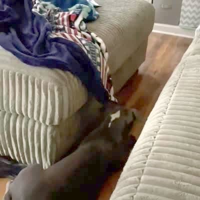 A pitbull dog lays on his back on the couch and then falls off the couch.