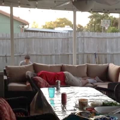 A man sleeps on a couch while behind him his son climbs a fence and lights firecrackers outside the window which go off and wake his dad up.