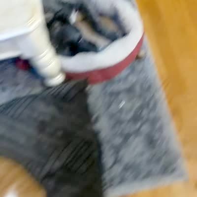 Large dog sleeps on the carpet and moves around a lot while dreaming. Dog propels himself around almost in a circle by rubbing his paws on the floor.