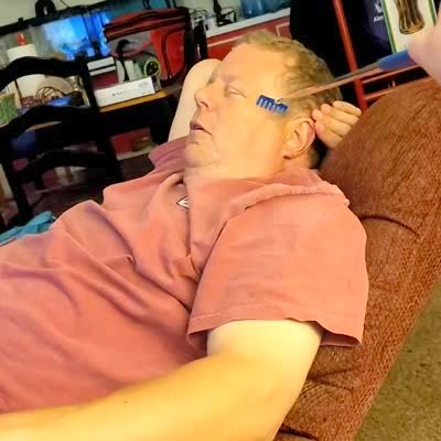 Dog licks sleeping man's mouth. He doesn't wake up for a while.