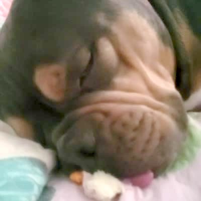 An English Bulldog dog sleeps and snores indoors and each time he breaths out, his jowls and cheeks flap.