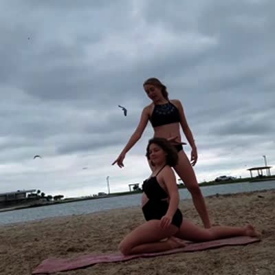 A teen girl helps a second girl flip over so that a third girl can hold her up on the beach and the second girl falls while she flips onto the girl on the ground.