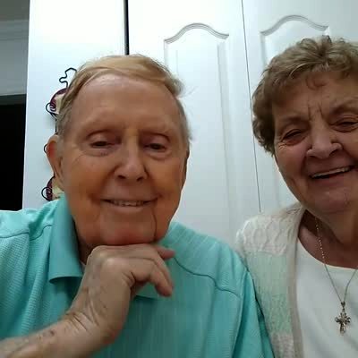 A senior man and woman record themselves as they pose for a photo in the house. The woman says "we gotta get rid of that neck", and they both put their hands over their neck skin.
