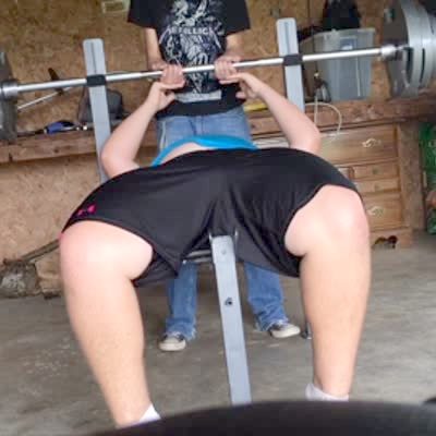 A teen boy bench presses a large amount of weight but can't lift it and when it falls on his neck he asks for another teen boy to help. When the second boy can't help, he takes weights off one side and the first boy falls to the side off of the bench.