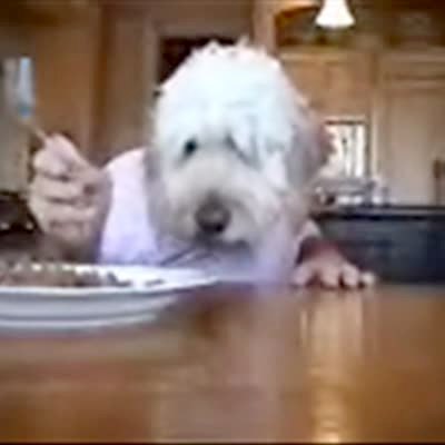 Man puts hands through a shirt with a dog's head sticking out of the neck collar and feeds the sheep dog with a spoon. Looks like a dog with human hands.