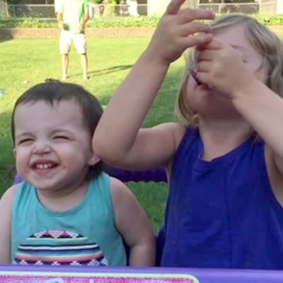A woman laughs at a frog on the back of her neck and says "get it off" repeatedly, and then a young boy reaches for it but it jumps on his head. He screams but then laughs as well.