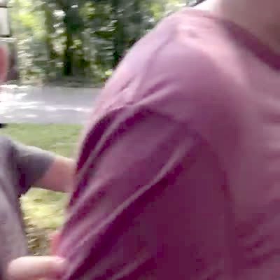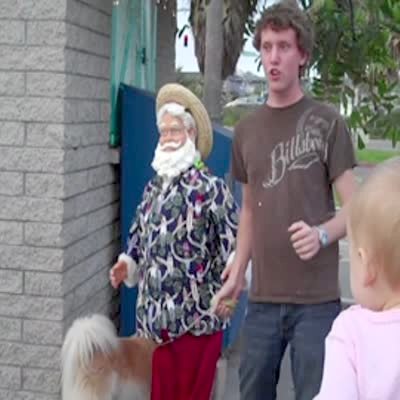A senior man on a scooter rides down a hill into a yard accompanied by his family. Around 1:35 he attempts to drive the scooter up a ramp onto a porch but he drives over the porch and crashes through a wooden fence and falls over the other side of the porch.
