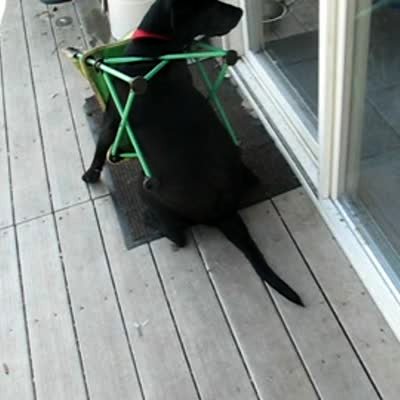 A woman explains that she left her dog on the porch and then looks out the window to the porch and doesn't see the dog. She goes to the next room over and sees the dog with a broken screen door around its neck and starts to scold it.