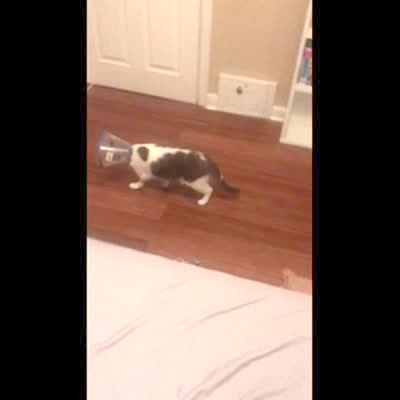 A cat walks around the bed with a cone around its neck then stands up on two legs and falls over backwards