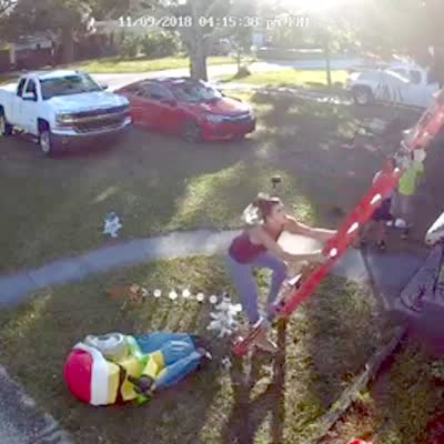 A woman stands on a ladder in a front yard and tries to hang Christmas lights. She climbs down and picks up the ladder, and starts to carry it across a yard. It falls on her head and gets stuck around her neck, and she falls backwards on the ground. Video from home security camera.