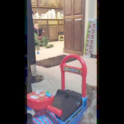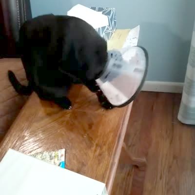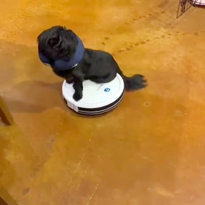 A dog with a neck brace rides on a motorized vacuum through the kitchen. Music rights not cleared.
