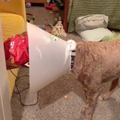 A dog with a cone around its neck stands in a room with a bag of Doritos chips stuck on his head.