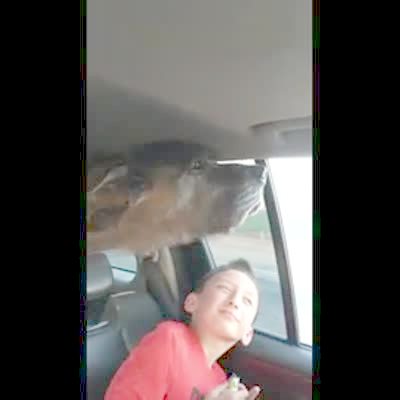 A donkey sticks its head through a car window and makes faces at a teen girl in a drive-thru safari.
