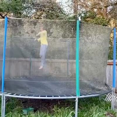 A young boy does a flip on a trampoline in the backyard, but he lands on his head.