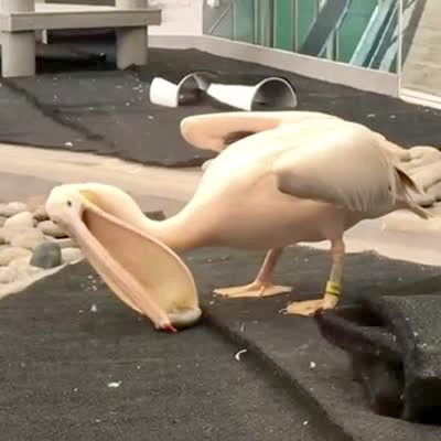 A pelican tries to pick up a rock but cannot angle its head properly, and another bird watches.