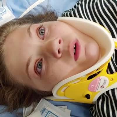 A young girl in a neck brace at the hospital exclaims "wow!" after her a woman off camera tells her she fell and broke her arm.
