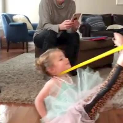 A young girl has a band around her neck and feet but it slips off of her feet and hits her face.