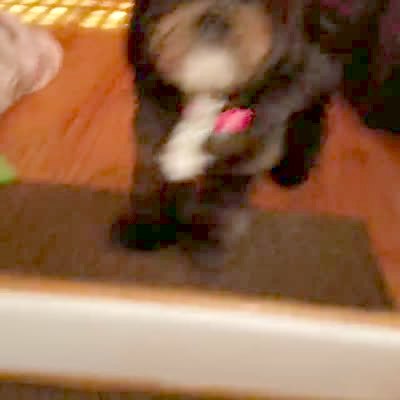 A small Chihuahua puppy dog runs around a man's head and neck while he sits in a living room chair. Featured talent cleared (the man).