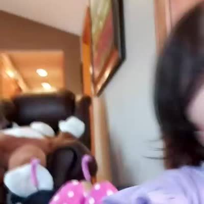 A woman tells a tot girl to say "Happy Birthday" at home, and she babbles. Then the girl takes the camera and runs away with it while the woman asks her to give it back.