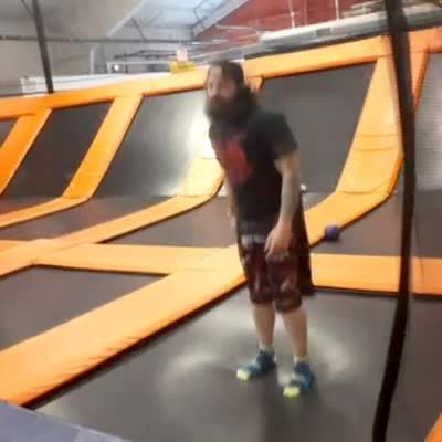 A man tries to do a backflip on a trampoline but he lands on his head in a trampoline park.