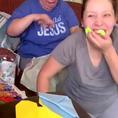 A woman bites a piece of pasta in her mouth when her mother cracks her neck. The woman screams when she thinks she hurt her daughter who rolls on the living room floor and laughs.