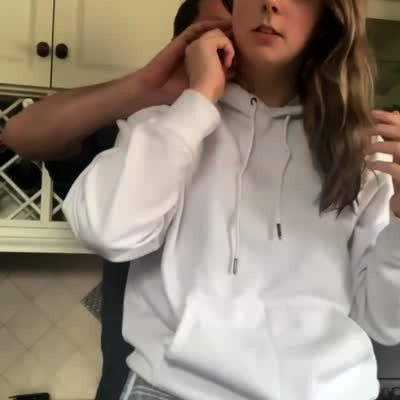A woman does the uncooked pasta prank to a man in the house, and when he tries to crack her neck the woman bites into the pasta and he jumps in the kitchen.