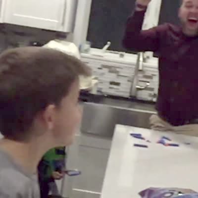 A man uses a nerf gun to shoot a chip out of his young son's mouth in slow motion.
