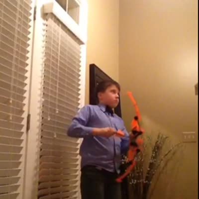 A boy fires a toy NERF gun bow and arrow at home. The dart bounces off of a wall and hits him in the eye.