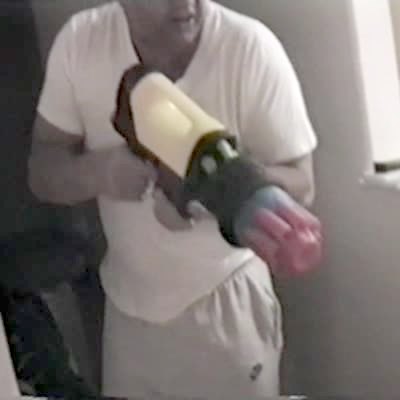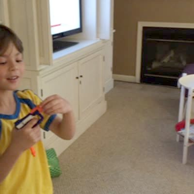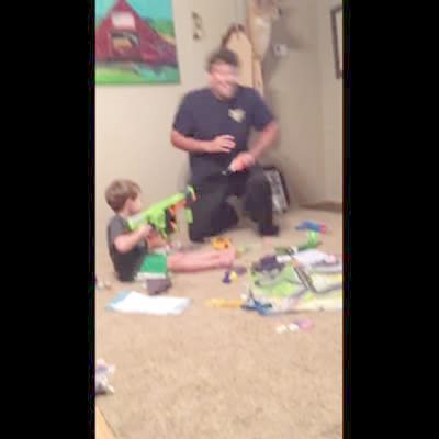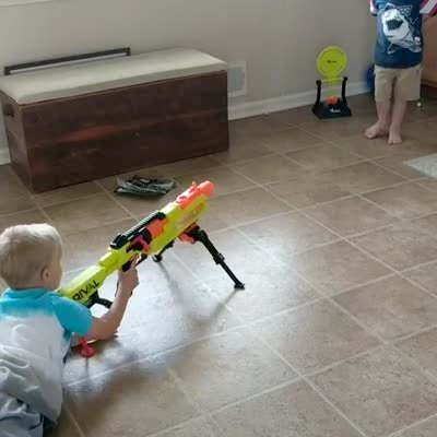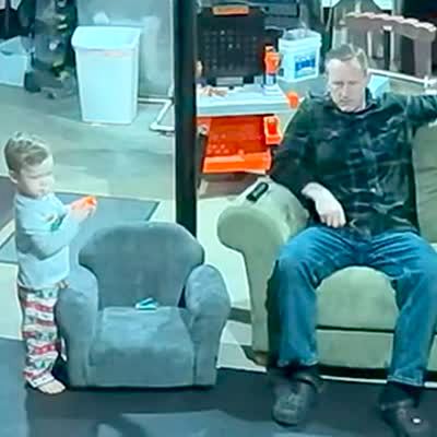 A tot boy shoots a Nerf gun at a man's face in a living room. The man doubles over and the boy drops the gun and walks away. Security Footage