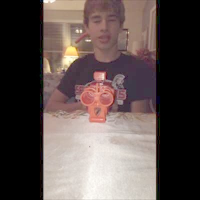 A teen boy shoots a nerf gun at the camera. The dart bounces off the camera in slow motion and hits the boy in the face.