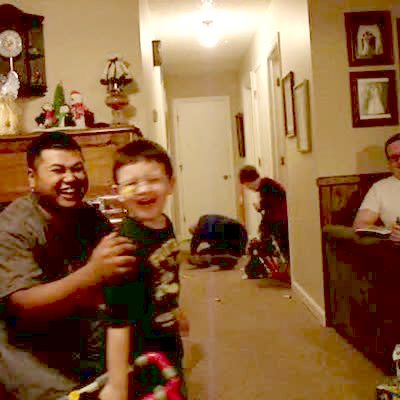 Dad & boy play with Nerf guns in the house. Boy shoots man & gets a Nerf arrow stuck in his glasses. Man plays dead in the hallway.