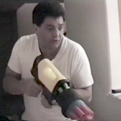 As a young boy plays a virtual reality game, a young man goes close to his groin and shoots him with a nerf gun down there. The boy falls off his chair in pain.