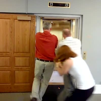 A man stands in an elevator as the door opens. Suddenly, several men and women shoot him with nerf gun darts and they laugh. He says 'I knew it' right before they shoot him. Pranks.