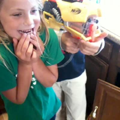 Young boy shoots a Nerf gun tied to his sister's loose tooth, they pull the tooth out. Siblings.