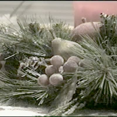A young boy shoots a nerf gun in slow motion on the porch at the screen on the ceiling and the dart hits all the winter snow on the roof and it all falls off the side of the roof to the yard below.