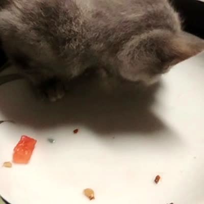 A gray kitten cat eats chunks of watermelon. A black cat's paw reaches in from off camera and steals a piece. food