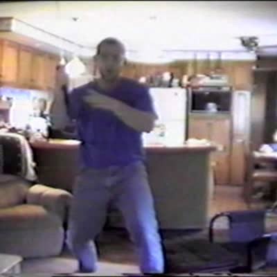 Bonehead samurai guy swings ninja sword around, does martial arts moves. He kicks stool & hurts his foot. Living room.