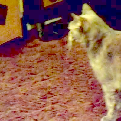 Two cats play fight in a living room. One cat does ninja like moves and a flip, trying to intimidate the other.
