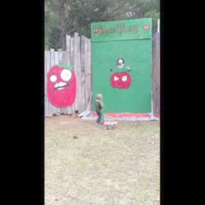 A young boy dressed as a Ninja Turtle for Halloween throws a tomato at a man behind a board after the man calls him "Almost adorable" outdoors. AA: Halloween.
