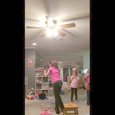 A girl teaches younger kids how to fight like ninjas with a yard stick and accidentally hits a ceiling lamp and breaks it. A girl gasps and says "you shouldn't have done that!" Action starts at 1:05