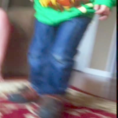 "Ninja Worrier" A man plays with a young boy and pretends that he is a ninja turtle and when he pins the young boy to the ground, the young boy lifts the mask covering his face and says that he is just a human and he is just wearing a jacket in a house. Vine/Instagram video.