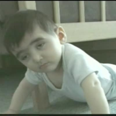 Baby boy holds himself up on the ground & tries not to fall asleep. Dad keeps waking him up by saying his name.