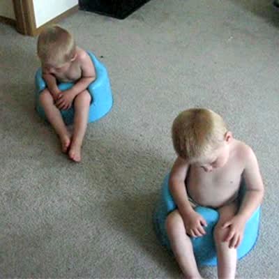 Twin tot boys falls asleep while sitting in little blue baby seats. Music plays in the background.