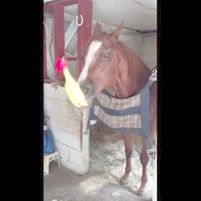 A horse nods its head while it holds a rubber chicken that squeaks in its mouth.