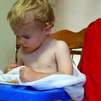 Toddler boy and girl nod off in their high chairs. Boy keeps hitting his head on the chair, girl falls forward.