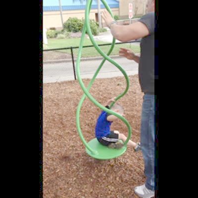 A man spins a tot boy on a spinning park structure outdoors and when he stops spinning, the boy leans forward and his head weighs him down, causing him to face-plant into the playground mulch.